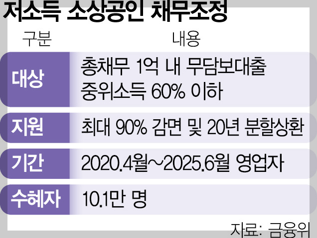 지원 대상은 중위소득 60% 이하 소상공인, 그리고 7년 이상 연체된 5000만 원 이하 신용대출 채무자입니다.